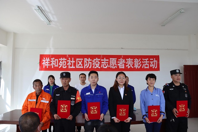 在這次表彰活動中,共授予23名志愿者和物業(yè)工作人員榮譽(yù)證書,祥和苑公租房項(xiàng)目經(jīng)理隗公樸接過鮮紅的榮譽(yù)證書說:在這次疫情防控工作中,祥和苑社區(qū)黨組織和物業(yè)公司黨支部對項(xiàng)目處工作人員的關(guān)愛,是物業(yè)人不斷奮戰(zhàn)的精神動力,有黨旗的地方就有力量,作為一名老黨員,我會牢記使命,不負(fù)榮譽(yù),不負(fù)職責(zé),帶領(lǐng)祥和苑項(xiàng)目處全體工作人員,積極配合小黑河鎮(zhèn)社區(qū)做好各項(xiàng)工作,再接再厲,守護(hù)好小區(qū)業(yè)主的健康和平安。