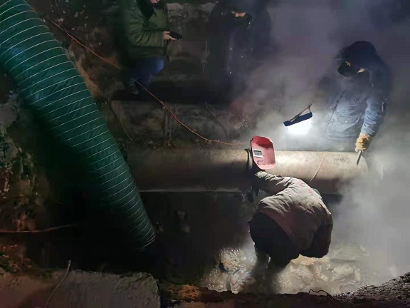 據(jù)悉,此次堵漏是將DN400的鋼管,上下一分為二,分為兩片,下面的部分加裝泄水閥,然后將上下合攏把原管道扣在里面,兩端用鋼板做內(nèi)徑250和外徑400的擋板,將泄露段整體包封在里面。水流從下部泄水閥泄走,不影響焊接,在整體焊接完,關(guān)閉泄水閥。