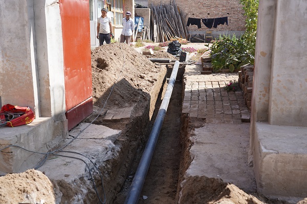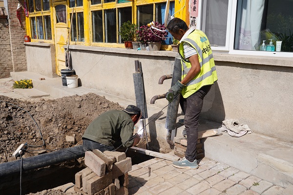 9月2日上午,在西黑河村的一戶村民院內(nèi),一名施工人員正在進(jìn)行院內(nèi)管網(wǎng)與入戶管網(wǎng)接口的焊接工作。