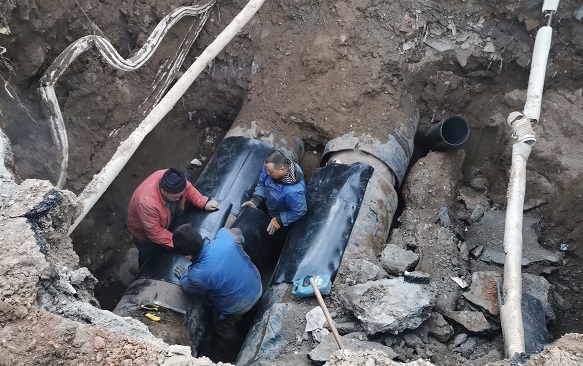 據(jù)介紹,該處主管道局部老化,多處漏水,要從根本上解決問(wèn)題,只能采取換管的辦法。但如果換管,泄水換管周期長(zhǎng),而且需關(guān)閉環(huán)線(xiàn)主管,供熱期內(nèi)主管網(wǎng)水壓大,將會(huì)導(dǎo)致管道伸縮量較大,切割后容易造成管網(wǎng)移位,引發(fā)其他事故。同時(shí),發(fā)現(xiàn)幾處漏點(diǎn)位于管道底部?jī)?nèi)側(cè),漏點(diǎn)下方5公分處還有一趟水泥污水管,距離非常近,焊接漏點(diǎn)難度大。