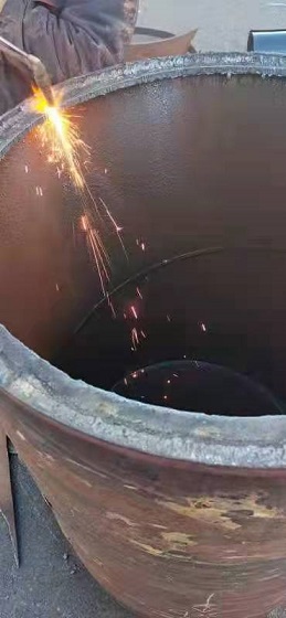 在場(chǎng)人員研究制定了搶修方案,決定不更換管道,而采用"包裹式"的方式進(jìn)行修復(fù)--在原DN700的老舊管道上包裹DN800的管套封堵漏點(diǎn),將DN800的管道切割成兩部分,分別安裝,與水泥管道接近的部分打磨成壁度在4公分以?xún)?nèi)的管壁,焊接后進(jìn)行管道碰口。當(dāng)時(shí),室外溫度已降至-15℃,地溝內(nèi)溫度高,地面溫度低,施工難度大。為保證快速、高效、安全完成新管套接,搶修人員只能手提工具沿著管道貓著腰爬到連接處,窩在管道下方,在管套與管網(wǎng)連接處焊接。