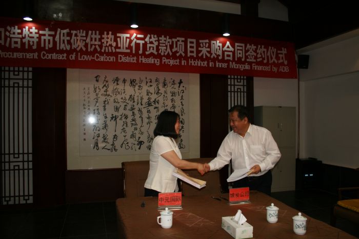 2016年6月30日上午11:30,內(nèi)蒙古呼和浩特市低碳供熱亞行貸款項(xiàng)目——城發(fā)公司辛家營(yíng)、金橋、毫沁營(yíng)區(qū)域集中供熱工程第6包采購(gòu)合同簽約儀式在城發(fā)大廈29樓會(huì)議室舉行。呼和浩特市城發(fā)投資經(jīng)營(yíng)有限責(zé)任公司與中標(biāo)單位中國(guó)中元國(guó)際工程有限公司共同在合同上簽字,標(biāo)志著亞行項(xiàng)目中的引熱入呼長(zhǎng)輸管線項(xiàng)目即將開工建設(shè)。