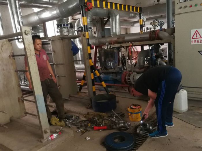 第一站為運(yùn)營二所儲運(yùn)熱力站,站內(nèi)一派忙碌的檢修景象,檢修人員正在拆解75KW循環(huán)泵。據(jù)運(yùn)營二所檢修助理尚帥介紹,此臺循環(huán)泵于2005年投入使用,運(yùn)行期間,可供儲運(yùn)小區(qū)、會計學(xué)校、煤炭大廈、以及中華家園一期等居民用熱。在拆解過程中發(fā)現(xiàn)循環(huán)泵電機(jī)線包有燒焦處并且發(fā)黑,電機(jī)端蓋也磨損嚴(yán)重。副經(jīng)理劉強(qiáng)仔細(xì)查看,囑咐二所人員針對老、舊設(shè)備工況應(yīng)及時采購更換以保證冬季采暖期熱用戶的用熱保障。隨后,前往運(yùn)營三所恒大G區(qū)熱力站進(jìn)行安全檢查,站內(nèi)檢修人員正在清洗除污器。