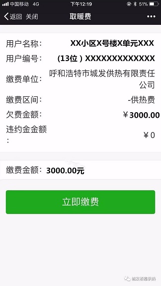 為確保廣大熱用戶安全交費,請務(wù)必按照下述正確操作流程進行交費,不要通過其他公眾號或個人生成的二維碼等平臺進入交費界面。按照正規(guī)通道進入微信平臺交費界面(無歷年欠費)操作流程如下:
