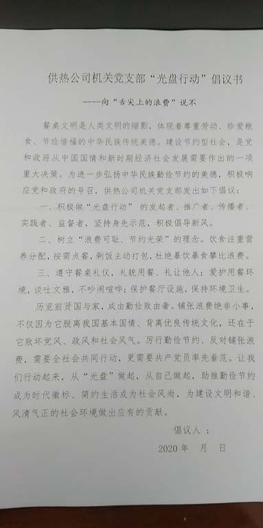 為了進一步弘揚中華民族勤儉節(jié)約的美德,積極響應黨和政府的號召。9月9日上午開始,城發(fā)供熱公司機關(guān)黨支部黨員、發(fā)展對象、積極分子共40人陸續(xù)簽署“光盤行動”倡議書。